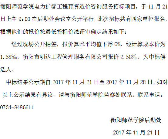 永利14m在线登录官网电力扩容工程预算造价咨询服务招标中标结果公示